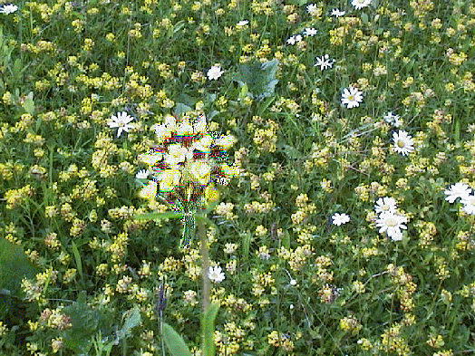 In dry meadows, Kidney Vetch can grow tall and slender, mostly it is a cushion plant that spreads about 16 inches across, a plant with narrow fingered leaves and a fragile stem. The flower is produced on top of the plant and comprise a round cluster of 30-40 yellow, brownish to red colouring and touches of white, occasionally pink or cream flower heads. It has the ability to fix nitrogen in the soil and cope with drought, especially where it's roots have a chance to go deep into the soil or sub-base. Often flowers best when every other plant dies in droughts, especially in dry quarries and beaches. |